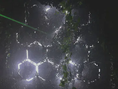 hexagonal lights behind foliage,